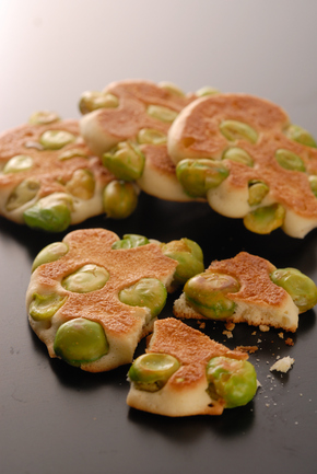 手焼きで焼いてます。豆の多い少ない、大きい小さいなど、不揃いですがそこがいいとよく言われます。厚焼きでソフトな歯触りの中に揚げたえんどう豆の塩気が絶妙です。