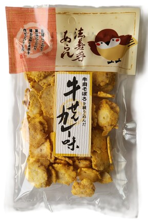 牛肉そぼろ煮を生地に練り込み、サクサク食感の煎餅に仕上げました。カレー風味。