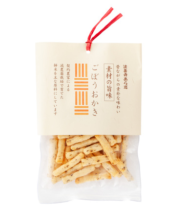 棒状のあられにごぼうを搗き込み焼き上げました。ごぼうの旨みをまるごと味わえる一品