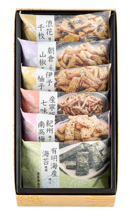 水稲もち米(国産)、しょうゆ加工品(しょうゆ、砂糖、たん白加水分解物、発酵調味料、その他)、砂糖、水あめ、海苔、柚子、梅肉、梅干シーズニング、柚子皮ペースト(柚子皮、砂糖)、七味唐辛子、山椒粉、大麦粉、あおさ、もちきび粉、もちあわ粉、アマランサス粉、白ごま粉末/調味料(アミノ酸等)、着色料(カラメル、パプリカ色素)、酸味料、香料、(一部に小麦・ごま・大豆・鶏肉を含む)